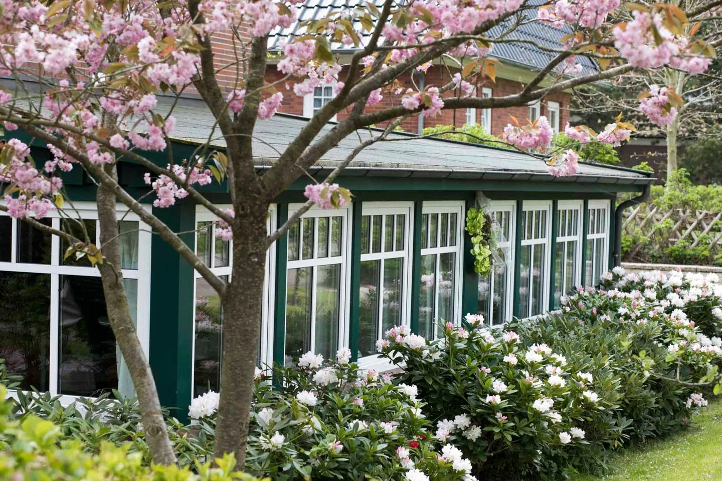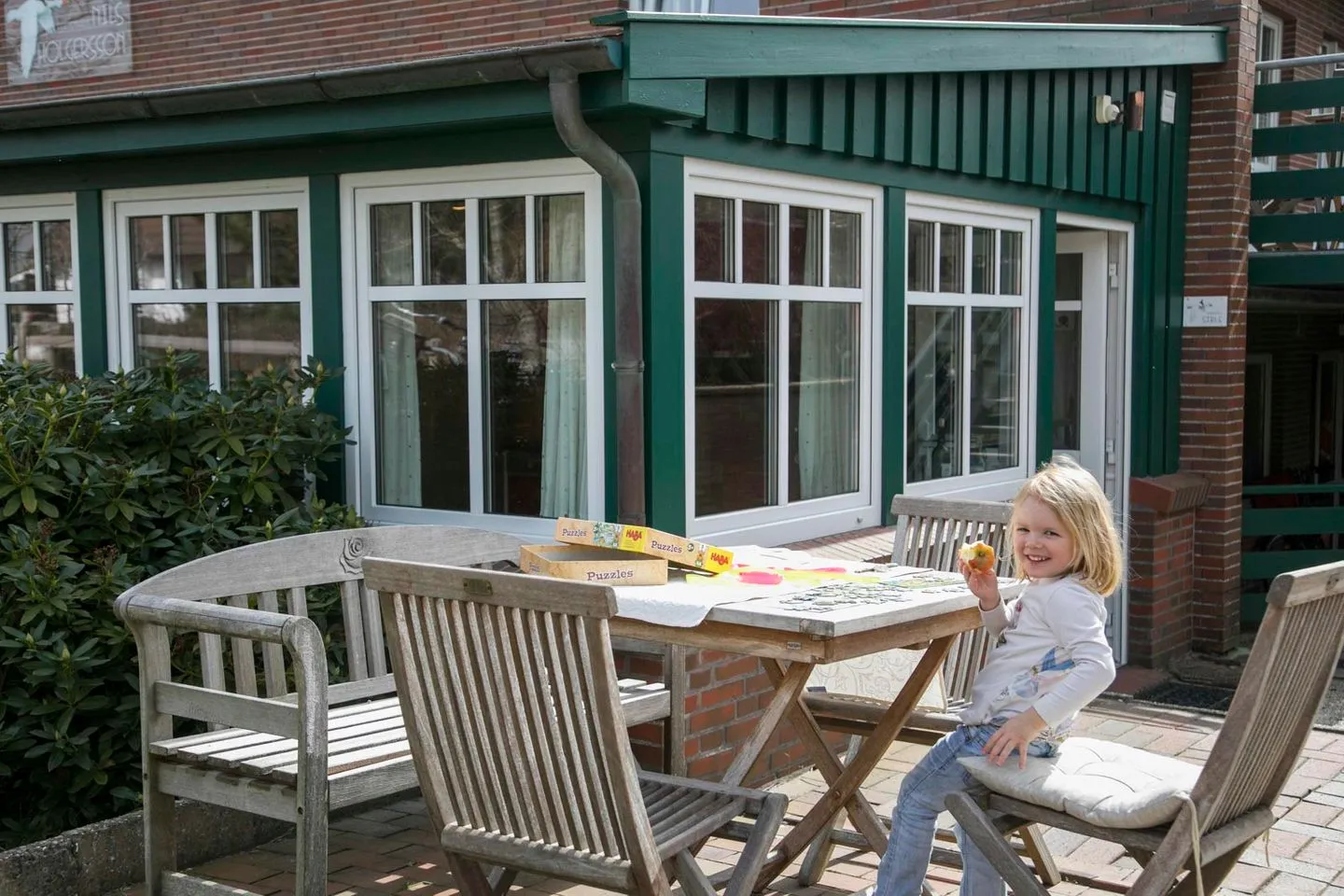Der neu angelegte Garten ist windgeschützt und bietet einen überdachten Sandkasten sowie Strandkörbe.