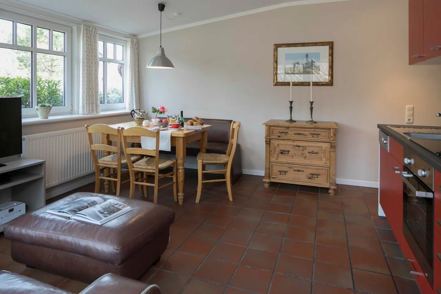 In der typischen Spiekerooger Veranda finden Sie das helle Wohn- und Esszimmer mit einer komplett neuen Küchenzeile, einschließlich Geschirrspüler. Der Steinfußboden in diesem Bereich wird durch die Fußbodenheizung auch im Winter angenehm warm.